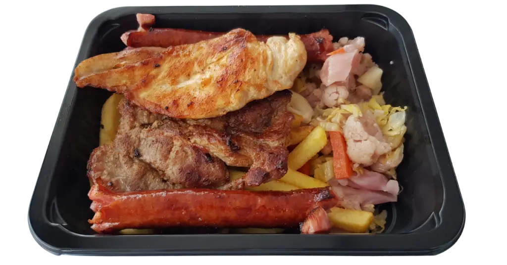Ingrediente: 750 g (ceafă de porc la grătar, cârnați semiafumati la grătar, piept de pui la grătar, cartofi prăjiți, chiflă, salată de varză)