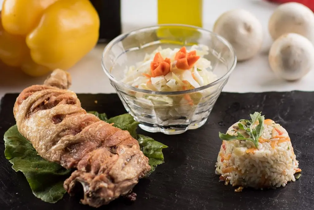 Ingrediente: 700 g (pulpă de pui dezosată la grătar, cartofi prăjiți, chiflă, salată de varză sau salată cu roșii, castraveți, ceapă roșie)