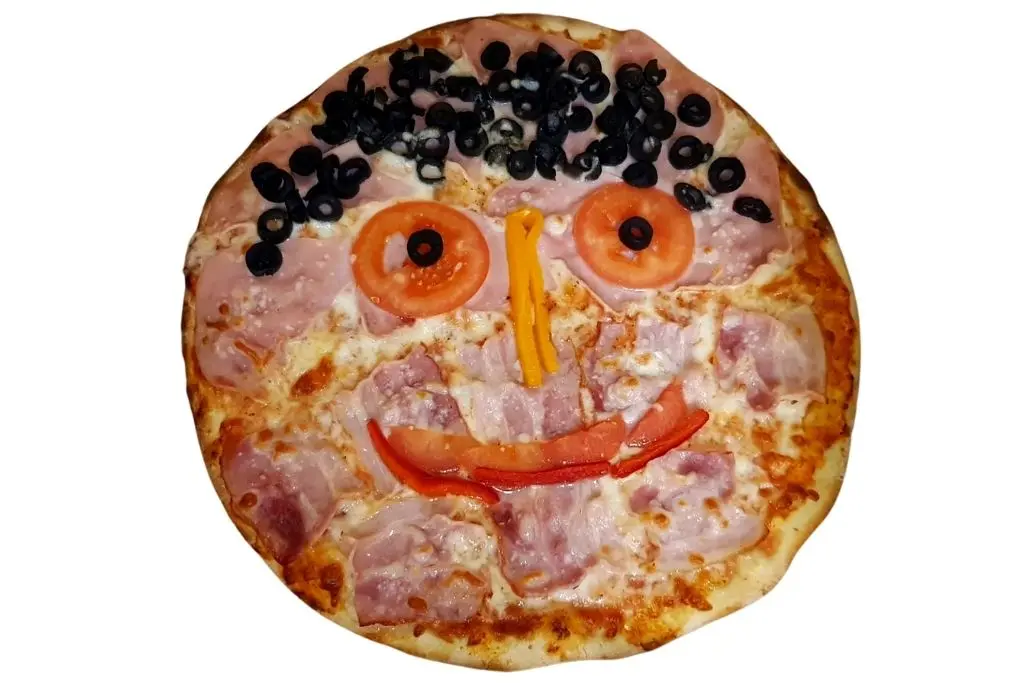 Ingrediente: 550 g (blat, sos pizza, topping mozzarella, șuncă presată, specialitate bacon, figură haioasă din legume: roșii, ardei gras, măsline)