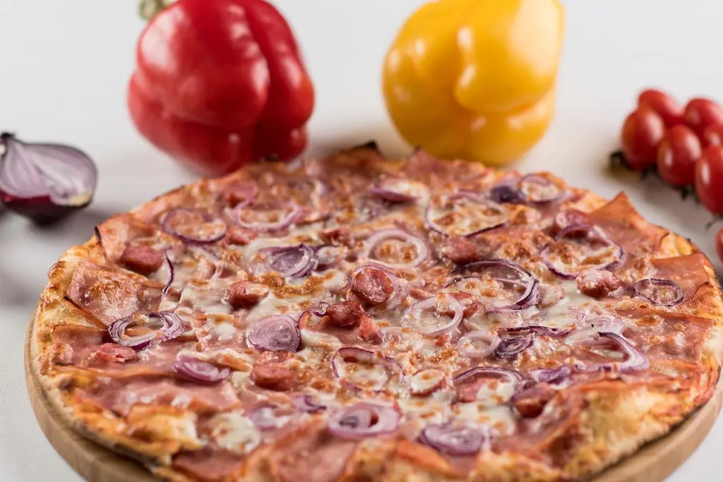 Ingrediente: 500 g (blat, sos pizza, topping mozzarella, specialitate bacon, cârnați semiafumati, ceapă roșie)
