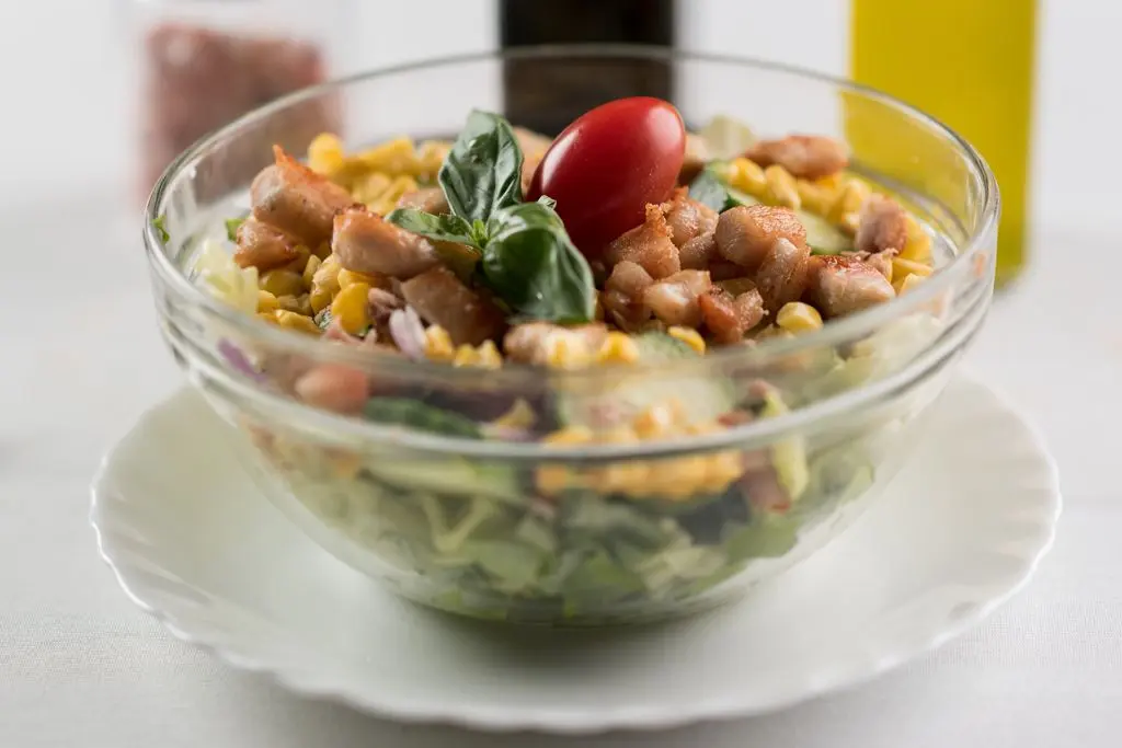 Ingrediente: 360 g (salată verde, roșii, castraveți, piept de pui, porumb)