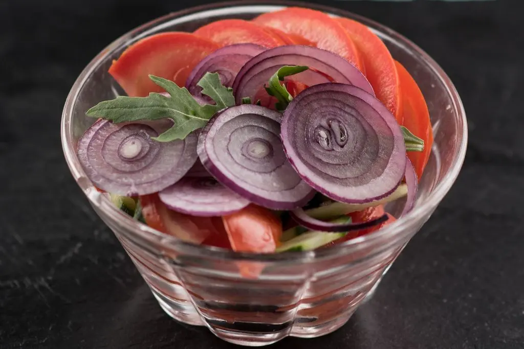 Ingrediente: 320 g (salată verde, roșii, castraveți, ceapă roșie)